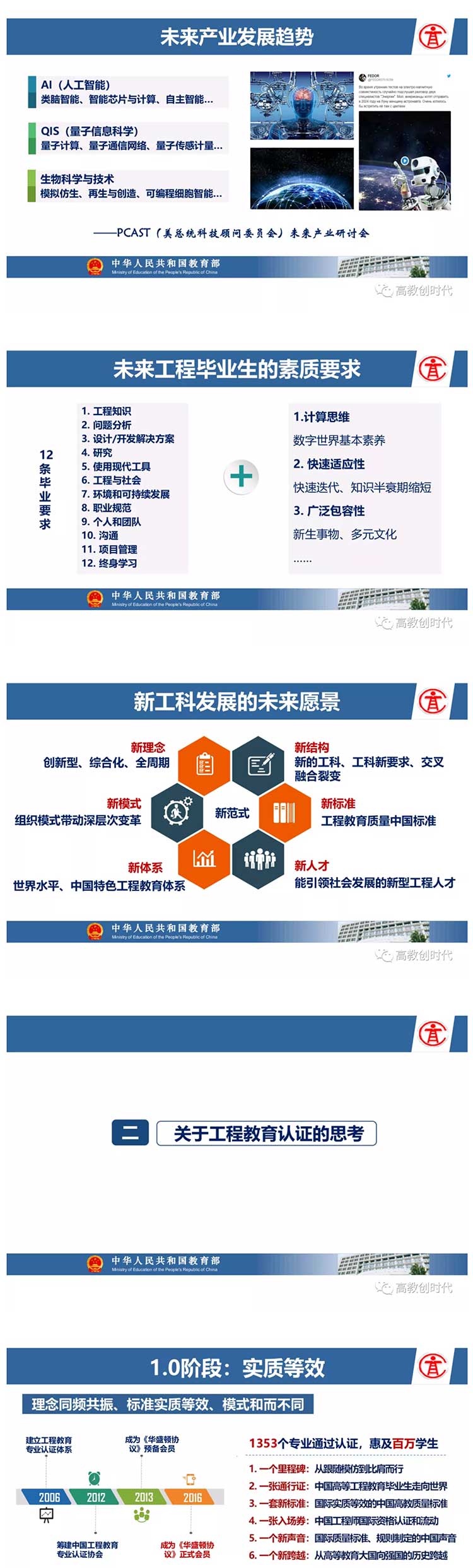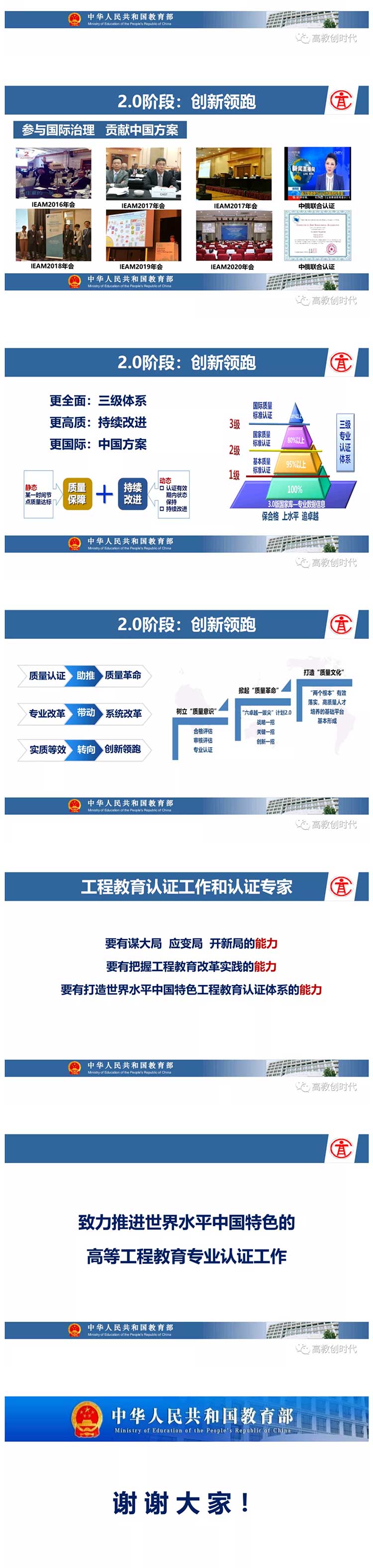 就如何更好更快推进工程教育认证工作,吴岩指出,我国工程教育认证要以“进入华盛顿协议成员国”的1.0版的实质等效阶段进阶到参与国际治理、贡献中国方案的2.0版的创新领跑阶段,要致力推进世界水平中国特色的高等工程教育专业认证工作。
