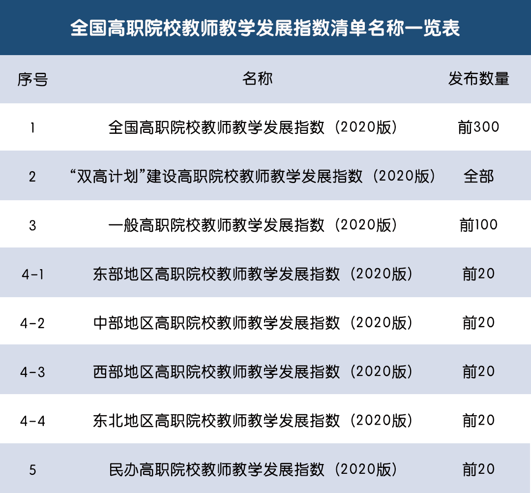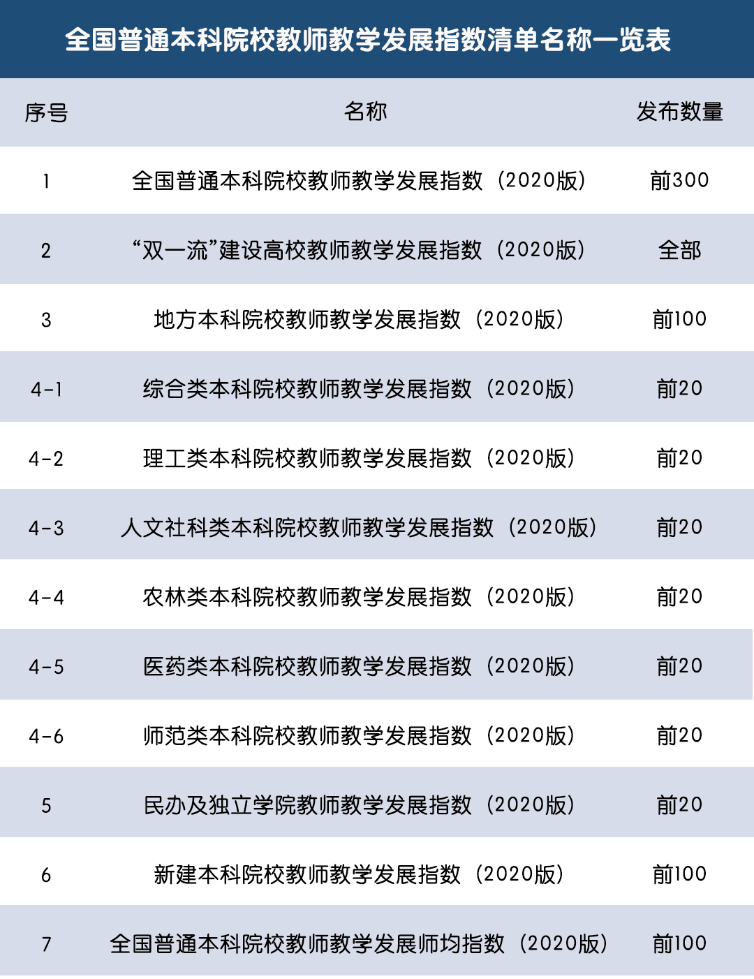2020年11月9日,中国高等教育学会高校教师教学发展研究专家工作组在第55届中国高等教育博览会“第二届高校教师教学发展与创新人才培养论坛”上发布全国普通高校教师教学发展指数(2020版)。包含“全国普通本科院校教师教学发展指数”和“全国高职院校教师教学发展指数”。