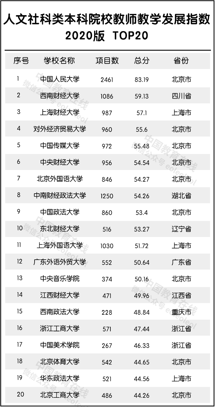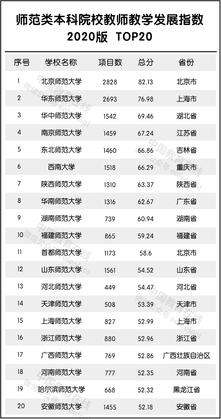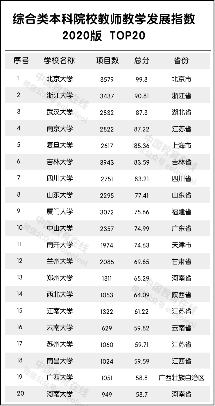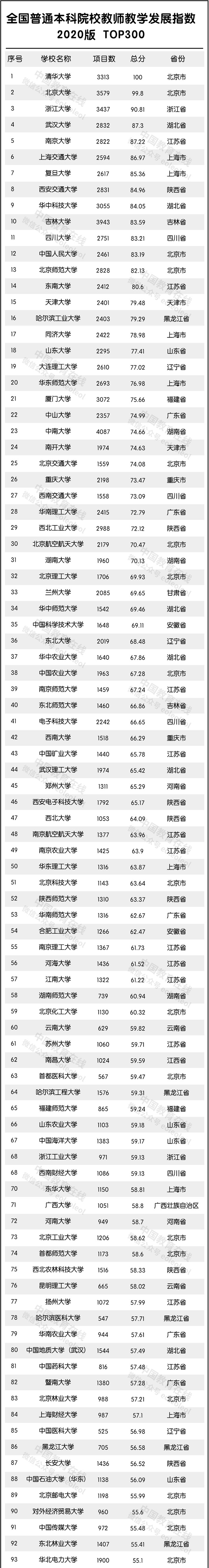 全国普通本科院校教师教学发展指数中,上榜普通本科院校达到1226所,占全国本科院校总数98.08%,比2019年增长1.1个百分点,排名前三的依旧为清华大学、北京大学和浙江大学。