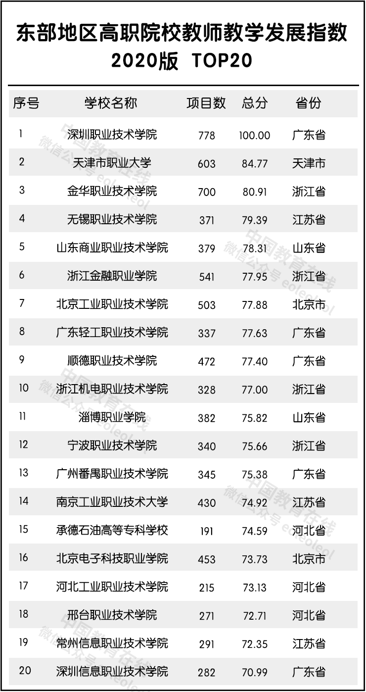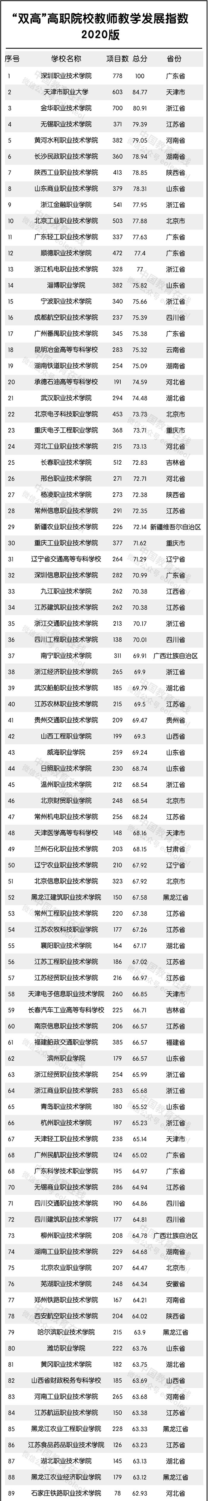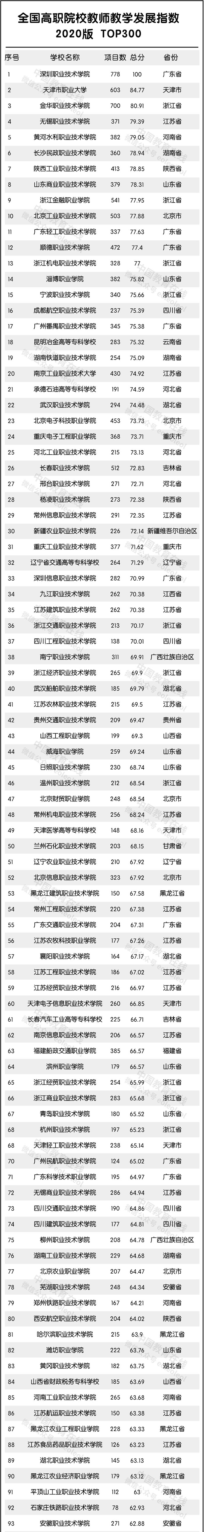 高职院校教师教学发展指数中,上榜高职院校达到1344所,占全国高职院校总数90.20%,比预发布时提高5.36个百分点,排名前三的为深圳职业技术学院、天津市职业大学和金华职业技术学院。